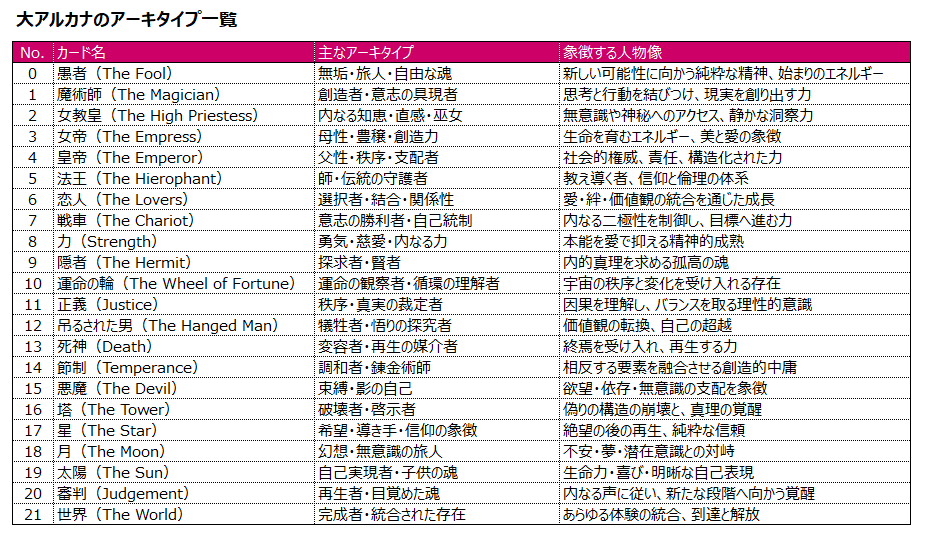 ここで、22枚の大アルカナにおけるアーキタイプの解釈例をご紹介します