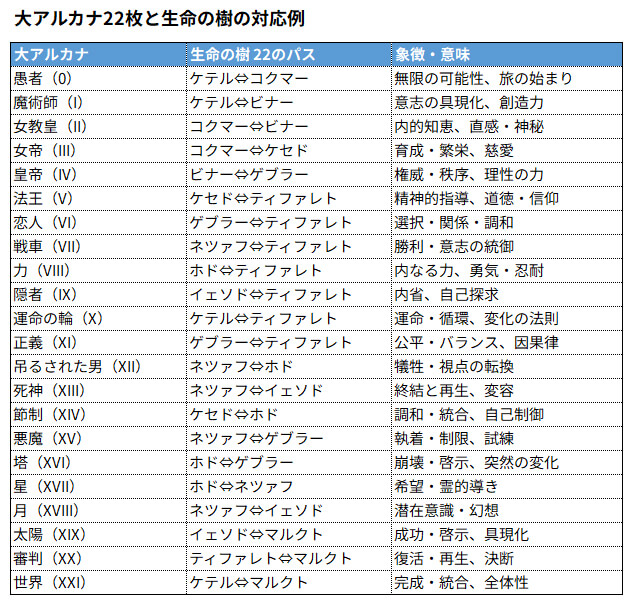 10個のセフィロトと22本のパスとの対応および象徴については以下の通り(諸説あり)ですが、これらを左右・上下に配置したことが、スプレッドの原型と言われています。