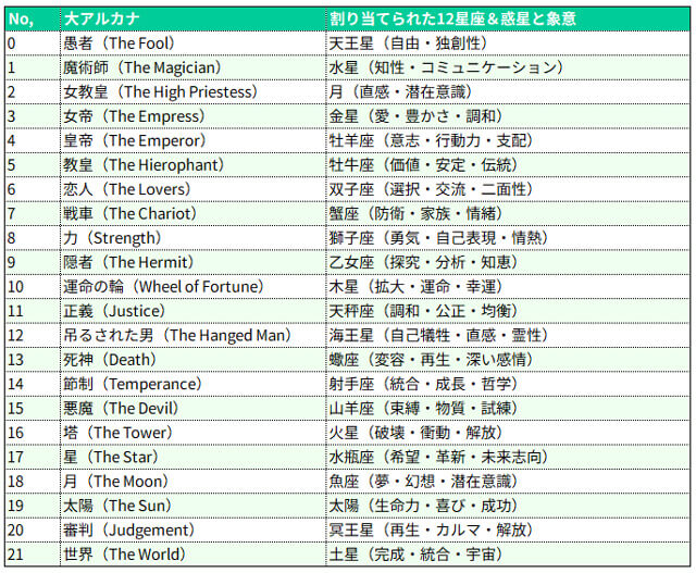 一覧表にありますように、12の星座、7つの惑星(水星・金星・火星・木星・土星・天王星・海王星)、3つの天体(太陽・月・冥王星)で合計22となり、それぞれの大アルカナカードに割り当てられています。